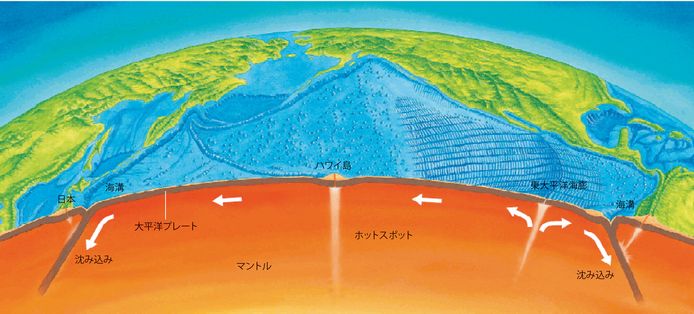 1年間に数cmの速さで両側に広がっていきます。これが海底を形づくっている「海のプレート」です。